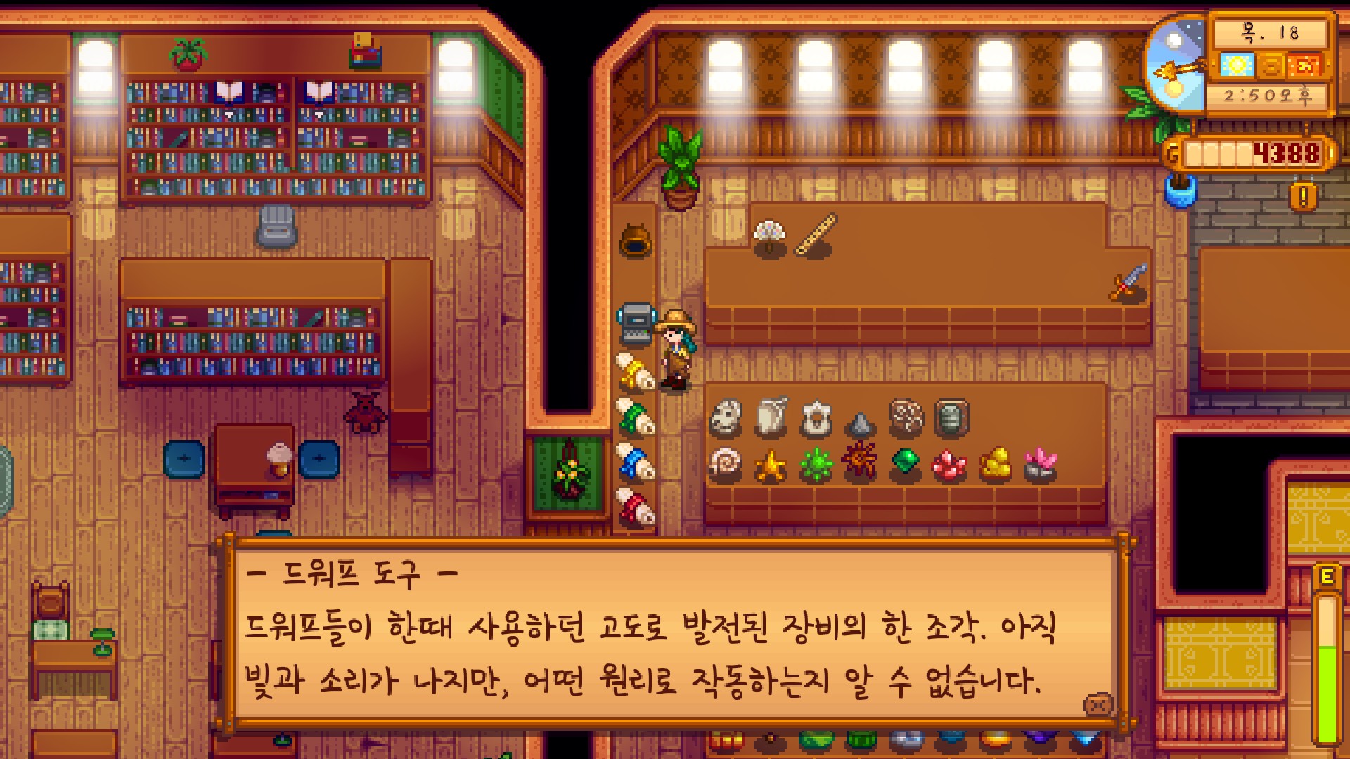 드워프두루마리 같은거랑 드워프 도구를 박물관에 다 기증했더니드워프어 번역 가이드 책을 주더라고요!드워프어를 배울 수 있다는데,아쉽게도 아직 드워프를 못 만났습니다.. 서적상이 왔을때 가격 카탈로그 책을 사봤습니다!탐나는 것들이 많이 있었는데 너무 비싸더라고요 ㅠ.ㅠ소유 중인 아이템의 가격을 볼 수있다고 하더라고요가격은 3000골드 였습니다. 아이템위에 마우스를 올려놓으면 맨아래 가격이 뜹니다!좋은것 같아요 ㅎㅎ합쳐져있는애들은 합산 가격이 뜹니다. 경품티켓으로 얻은 우정101책입니다!사람들과 조금 더 빠르게 친해질 수 있다고해요눈에띄는 변화는 잘 모르겠습니다만 좀 더 호감도가 오르는거겠죠?여담으로 이 책은 팔면 3000골드를 준다고 되어있었습니다책도 중복으로 나오는지 모르겠지만..? 다음에 또 나오면 좋겠..